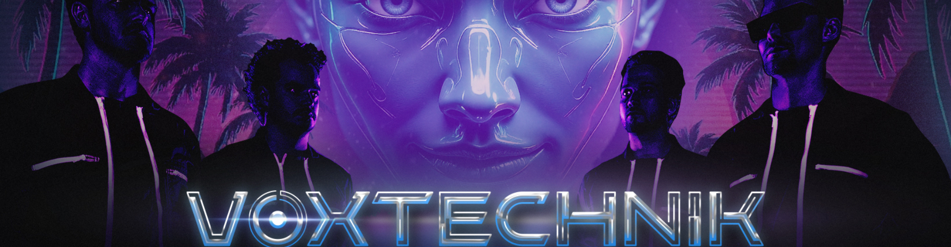 An iconic 4-piece 80s synth-pop LIVE band with original videoclips & immersive visuals, created by our 5th band member, a human friendly robot called: VOXTECHNIK.